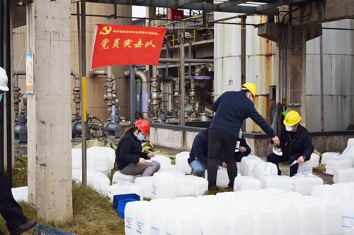 各基層黨組織在集團(tuán)公司黨委的統(tǒng)一指揮下,快速聯(lián)動(dòng)、協(xié)同作戰(zhàn),其中二級(jí)子公司海豐和銳黨委組織50余名黨員成立了“黨員突擊隊(duì)”沖鋒在前,堅(jiān)守崗位一線確保全天候生產(chǎn)消毒原液不停歇;集團(tuán)公司營(yíng)銷黨支部堅(jiān)決克服貨源稀缺、物流停運(yùn)等困難,千方百計(jì)找尋采購(gòu)渠道保障消毒液及包裝原料供給;集團(tuán)公司天暢物流黨支部日夜兼程奔赴疫情防控的前線,堅(jiān)決保障次氯酸鈉消毒原液捐贈(zèng)和配送。